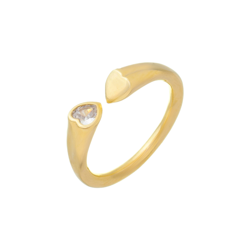 Moderno e elegante anel aberto com um coração liso e um coração cravação inglesa zircônia na cor cristal. Semijoia banhada com 10 milésimos de ouro 18K, com tratamento antialérgico e garantia de 1 ano. Nossas semijoias são um complemento perfeito para qualquer ocasião. (Observação: esse anel pode ser regulado para até 2 números maior).