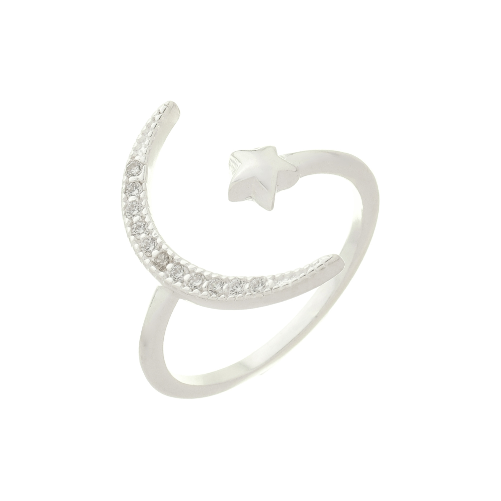 Moderno e delicado anel ajustável meia lua cravejada com microzircônias na cor cristal e estrela, em prata 925 com garantia vitalícia no metal. Elegância, modernidade e sofisticação ao visual.