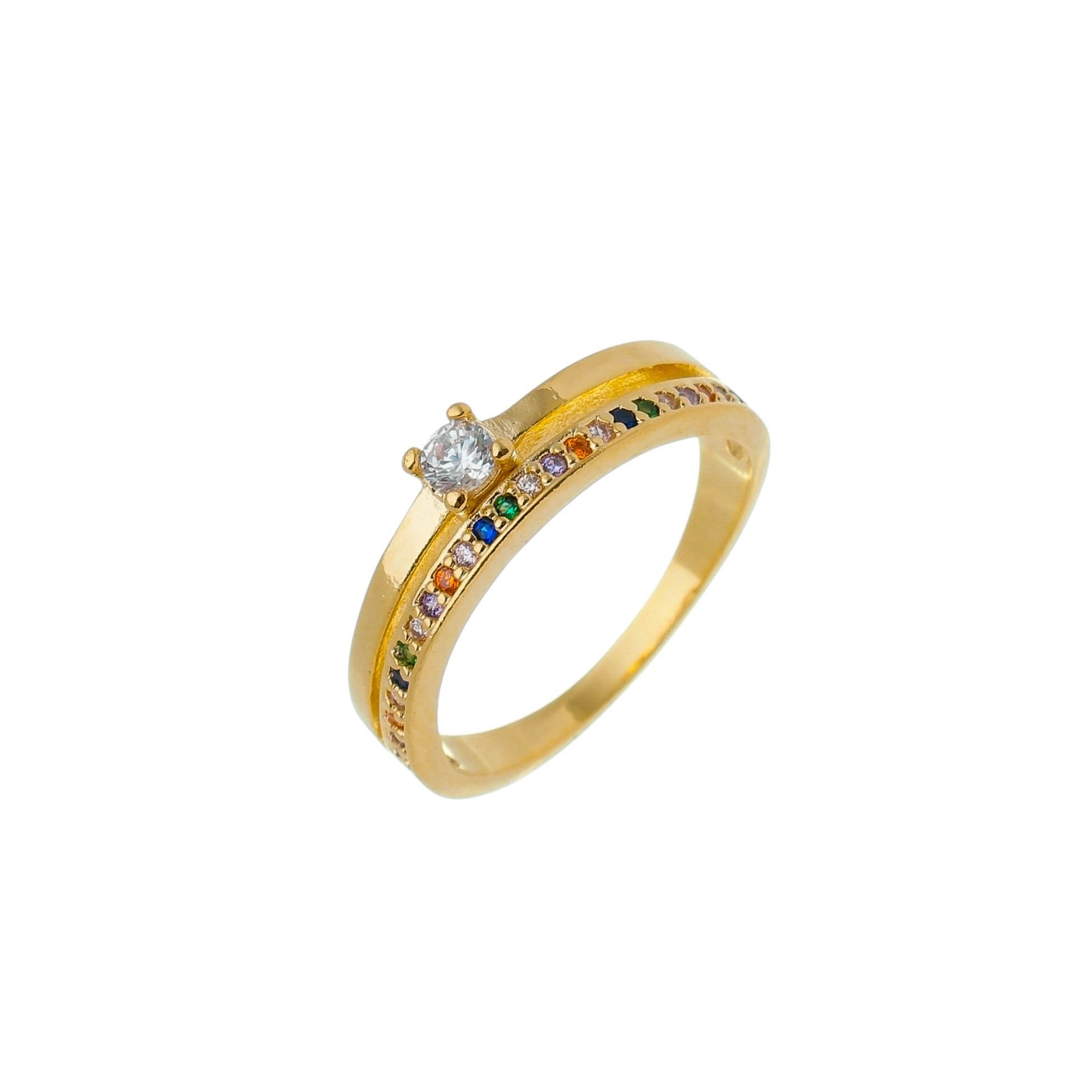 Lindo e clássico anel solitário com aparador cravejado com microzircônias coloridas. Semijoia banhada com 10 milésimos de ouro 18K, tratamento antialérgico e garantia de 1 ano.