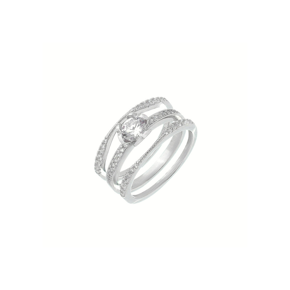 Moderno, elegante e sofisticado conjunto de anéis composto de um solitário com zircônia na cor cristal e dois aparadores, cravejados com microzircônias, para serem usados juntos ou separados. Prata 925 com banho de ródio branco e garantia vitalícia no metal.