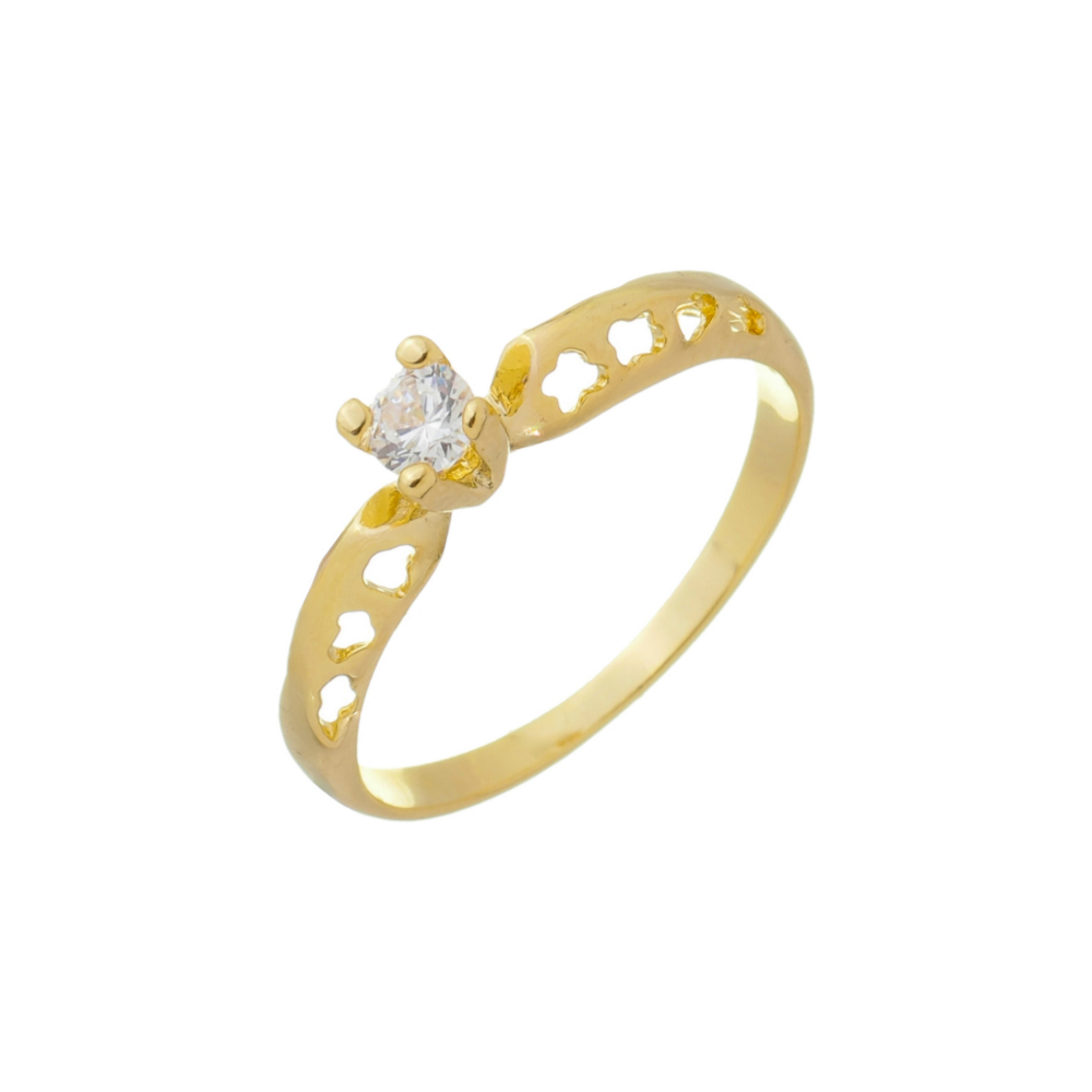 Clássico e delicado anel solitário com desenho nas laterais, com 4 garras e cravejado com zircônias na cor cristal. Semijoia banhada com 10 milésimos de ouro 18K, com tratamento antialérgico e garantia de 1 ano. Nossas semijoias são um complemento perfeito para qualquer ocasião.
