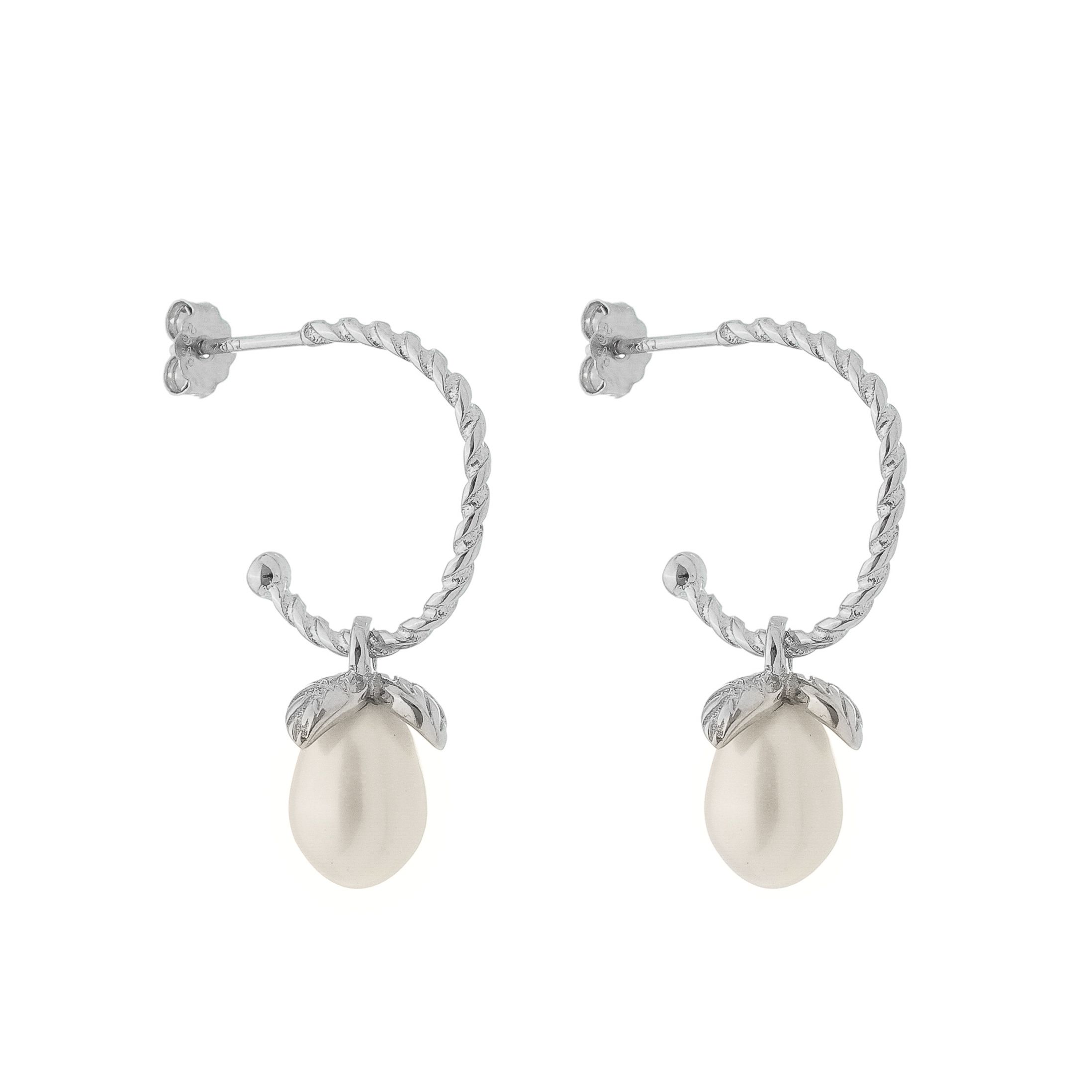 Lindo e luxuoso brinco meia argola de pino com pingente flor pérola de água doce em prata 925. Garantia vitalícia no metal.