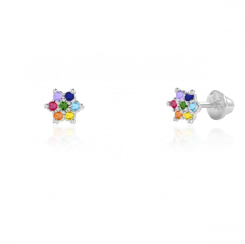 Brinco no formato de chuveirinho cravejado com zircônias coloridas e tarracha baby em prata 925. Garantia vitalícia no metal. Infantil ou usado no segundo furo.