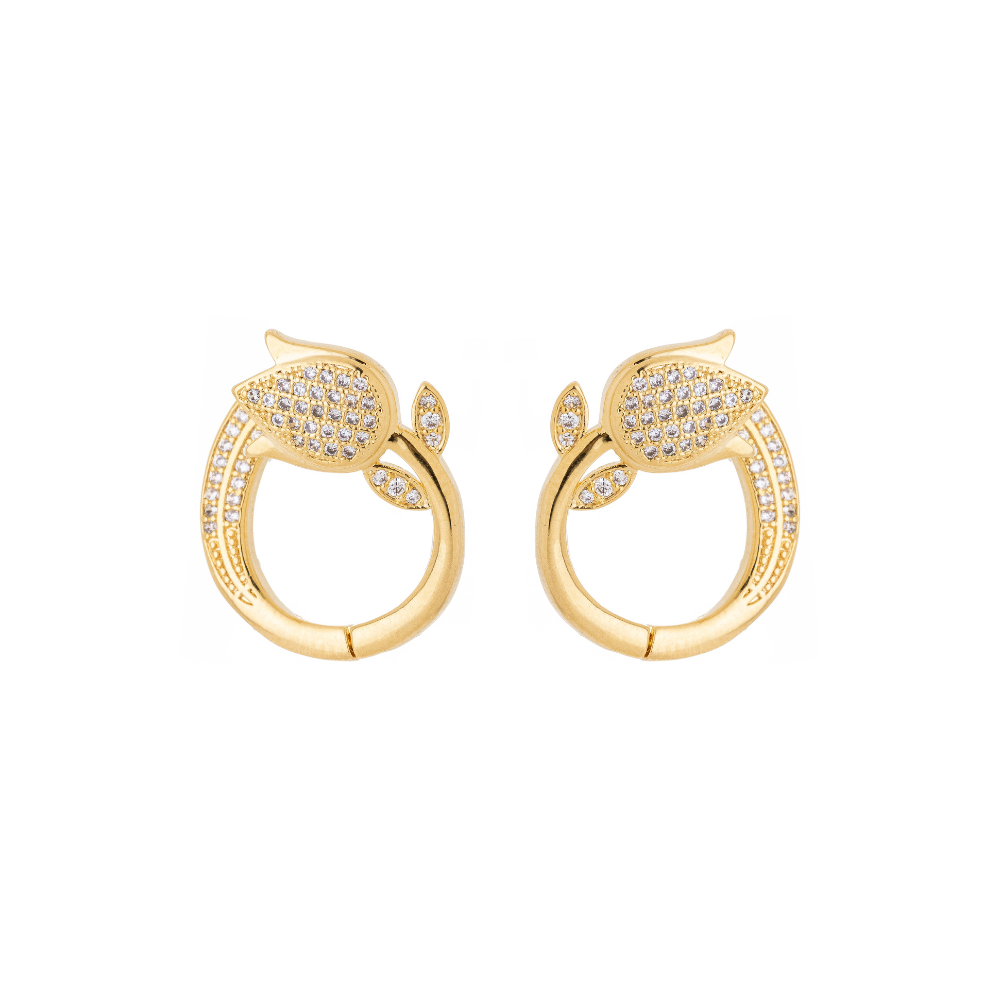 Luxuoso brinco argola articulada frontal com flor tulipa cravejada com zircônias e microzircônias na cor cristal. Joia banhada a ouro 18K, com tratamento antialérgico e garantia de 1 ano. Luxo e requinte para as suas celebrações. A arte que te completa.