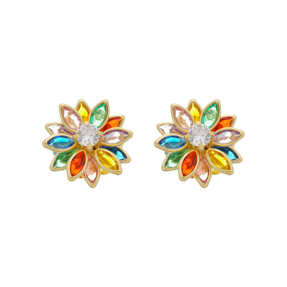 Clássico e delicado brinco flor com uma zircônia cravada no meio e as pétalas coloridas, com tarraxa. Joia banhada a ouro 18K, com tratamento antialérgico e garantia de 1 ano. Luxo e requinte para as suas celebrações. A arte que te completa.