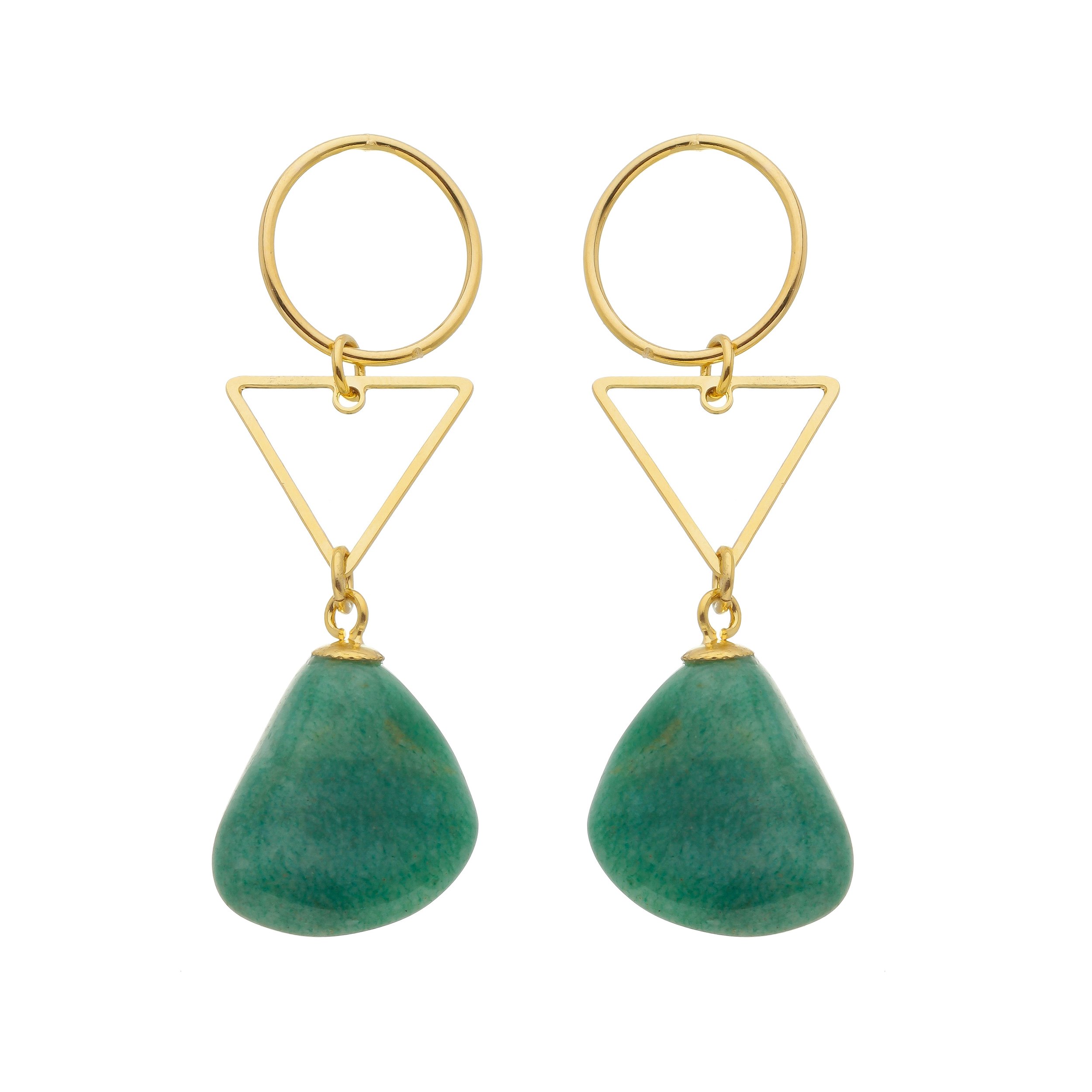 Moderno brinco geométrico de pino com tarracha grande composto por argola / triângulo com pingente em pedra natural Quartzo verde. Joia banhada em ouro 18K com tratamento antialérgico e garantia de 1 ano. Luxo e requinte para as suas celebrações. A arte que te completa.