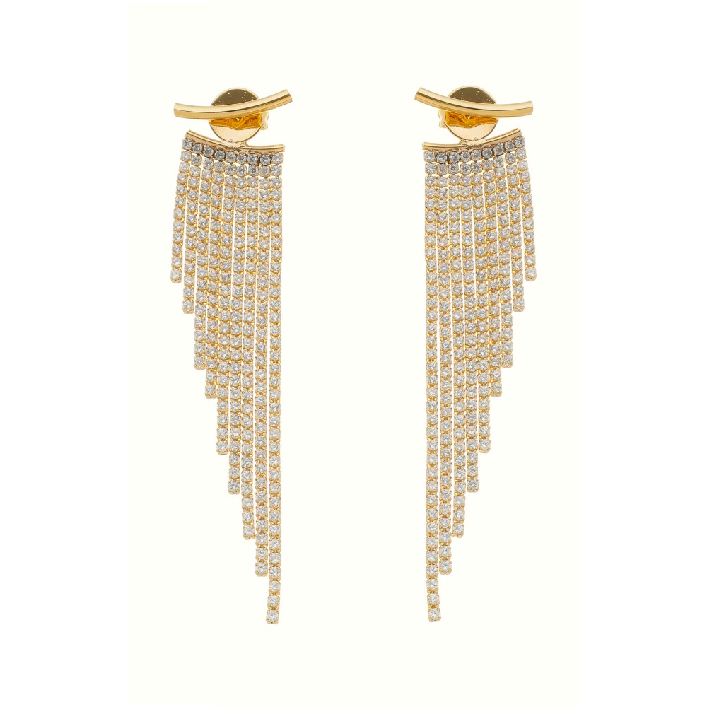 Luxuoso e moderno par de brincos de franja em casacata composta por nove fios longos cravejados com zircônias na cor cristal. Semijoia banhada em ouro 18K com tratamento antialérgico e garantia de 1 ano. Peça essencial para compor o seu look.