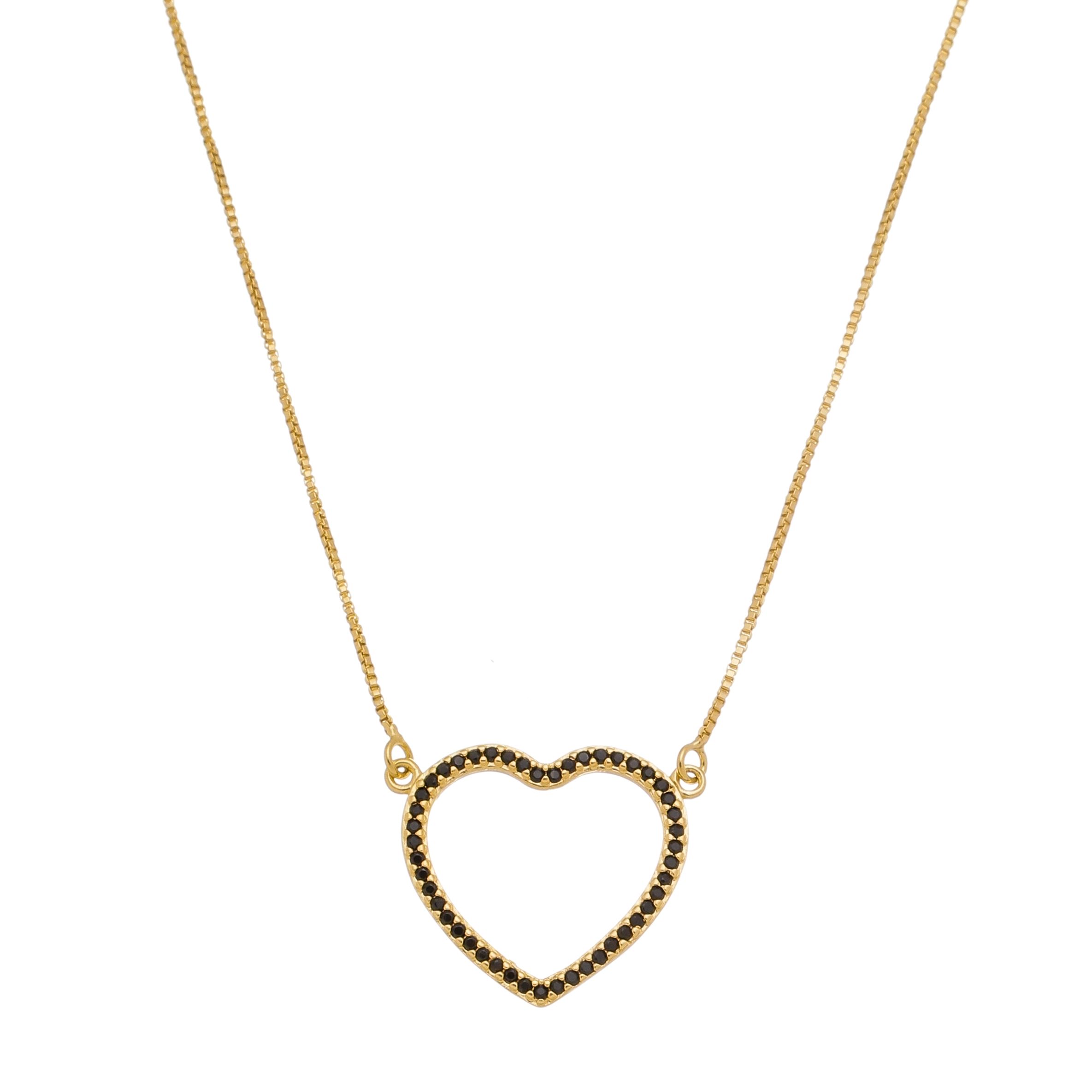 Corrente com pingente em formato de coração cravejado com zircônia preta. Joia banhada com 10 camadas de ouro amarelo 18k. Com garantia de 1 ano. Com você nos momentos especiais e grandiosos, demonstrando sua beleza e imponência.