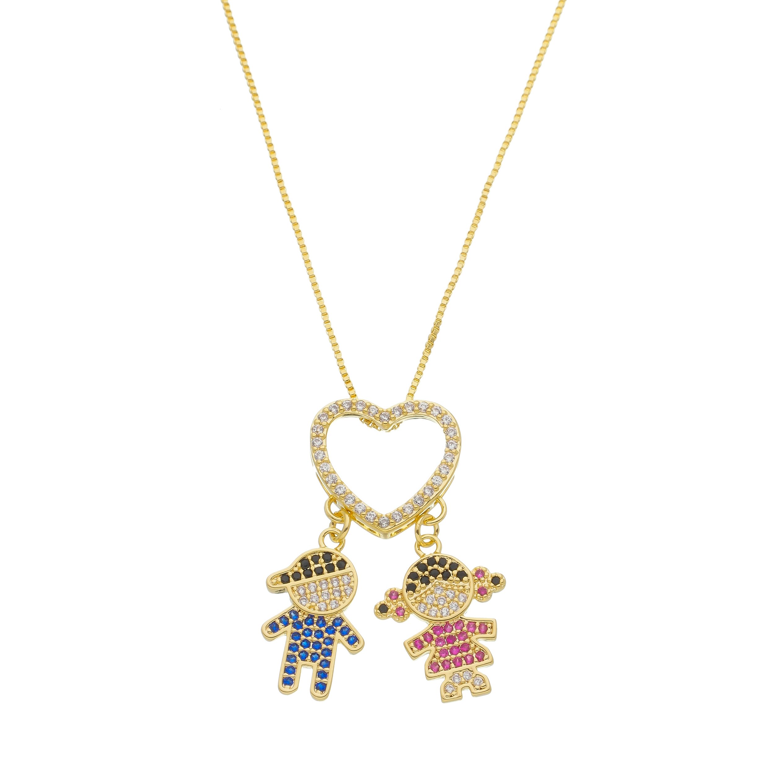 Delicado colar de corrente veneziana com fecho lagosta, pingente no formato de coração cravejado com zircônias na cor cristal, pingente menina de chuquinha cravejado com zircônias na cor rubi, cristal e preto e menino cravejado com zircônias na cor azul, cristal e preto. Semijoia banhada em 10 milésimos de ouro 18k, tratamento antialérgico e garantia de 1 ano.