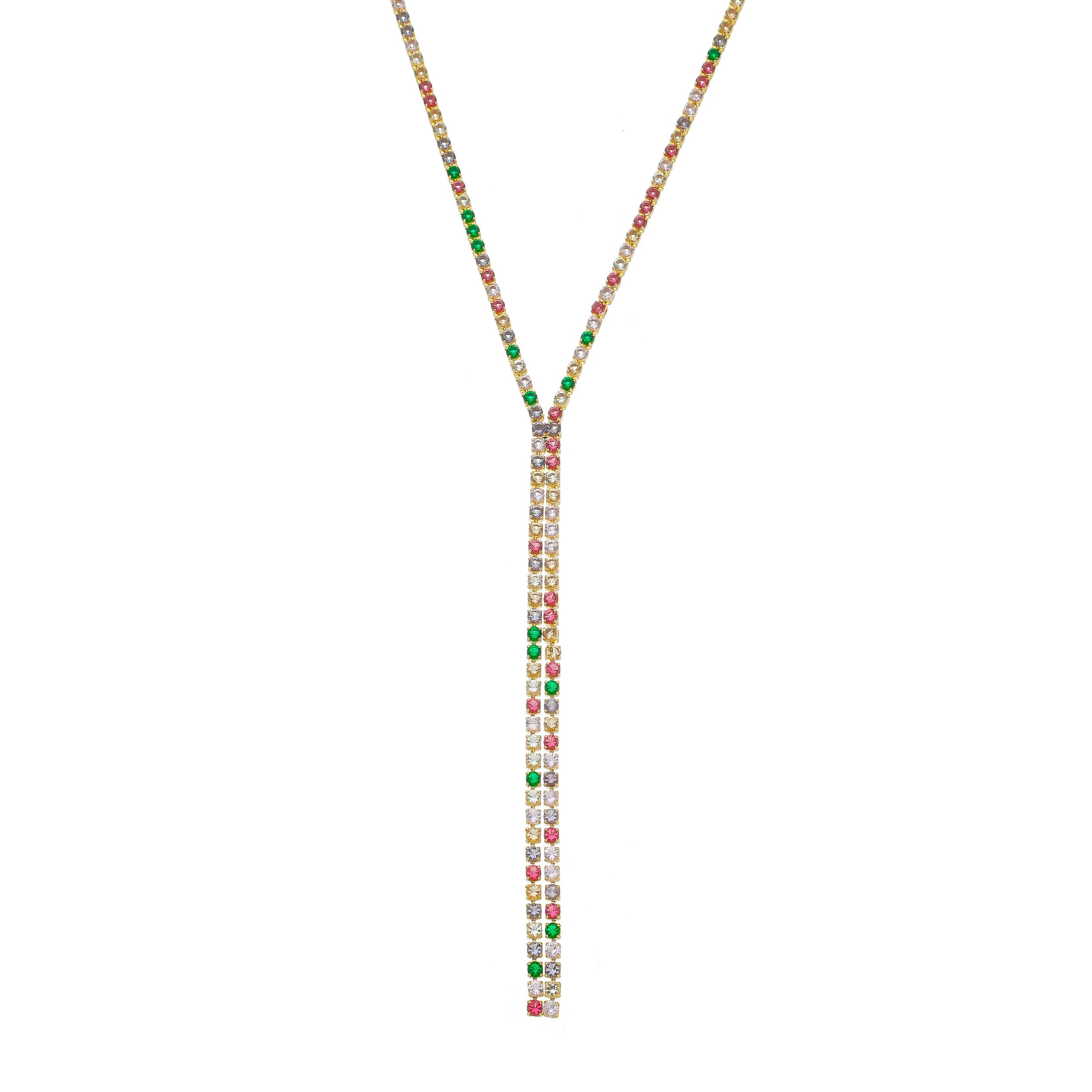 Moderno e elegante colar tipo choker cravejado com zircônias coloridas. Joia banhada com 10 miléssimos ouro 18 k, tratamento antialérgico e 1 ano de garantia. Para os seus momentos de celebração. Completando a arte perfeita que é você.