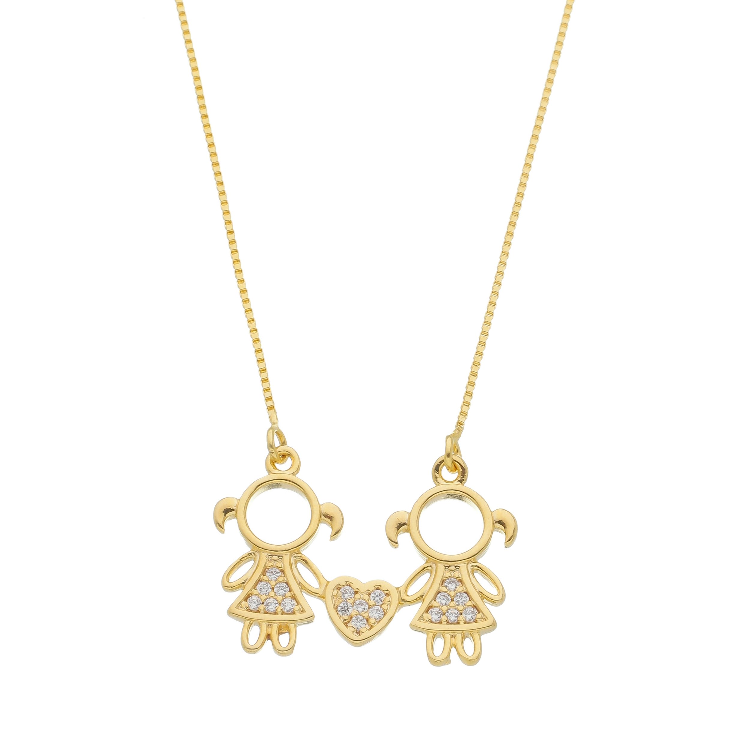 Lindo e delicado colar de corrente veneziana com fecho boia, pingente no formato de coração cravejado com zircônias na cor cristal e 2 meninas de vestido cravejado com zircônias na cor cristal. Semijoia banhada em 10 milésimos de ouro 18k, tratamento antialérgio e garantia de 1 ano. Para a melhor mãe do mundo.