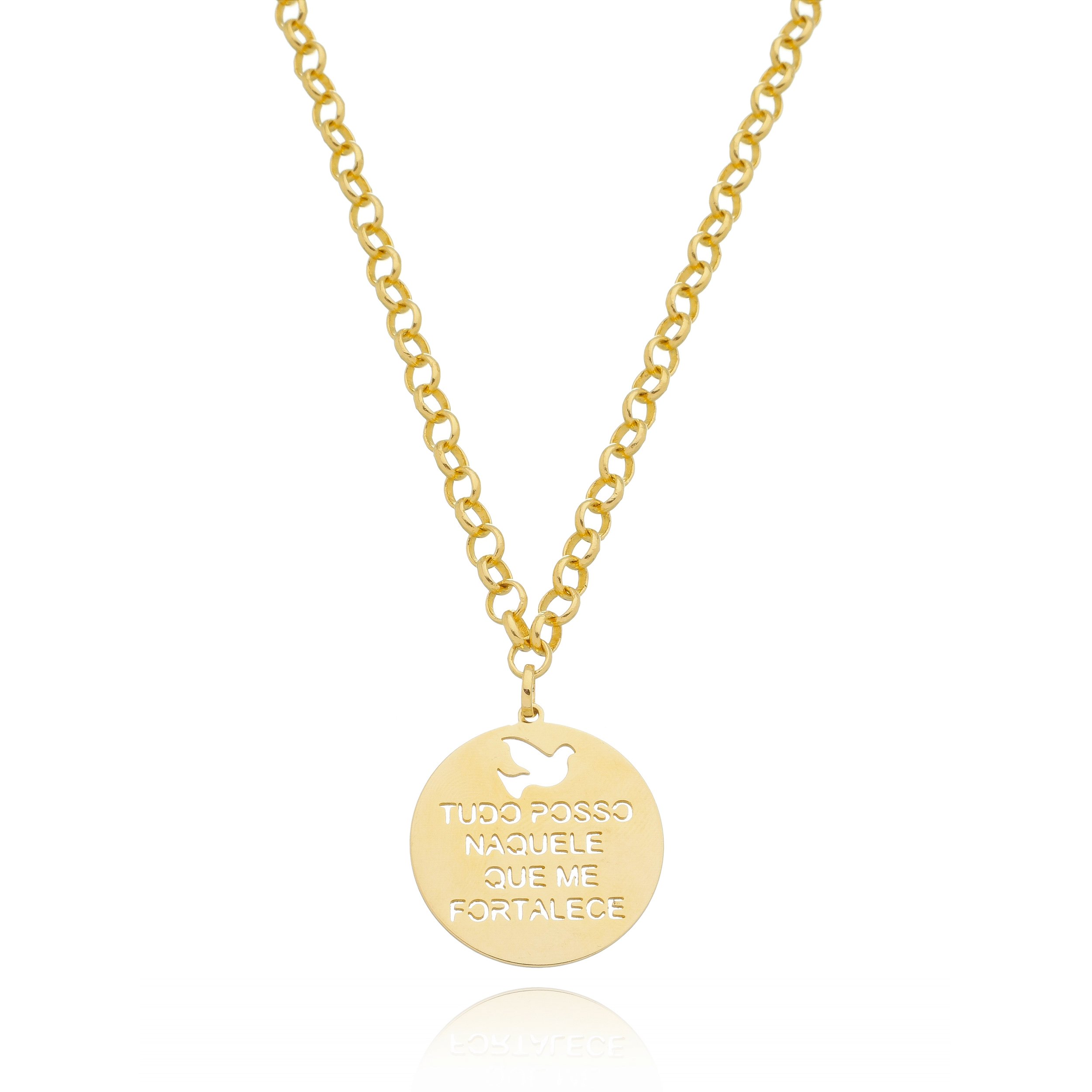 Modernidade e beleza você encontra nesse lindo colar de corrente elo português com pingente redondo escrito tudo posso naquele que me fortalece. Semijoia banhada em 10 milésimos de ouro 18K, tratamento antialérgico com 1 ano de garantia. Com você em todos os momentos, destacando sua beleza e grandiosidade.
