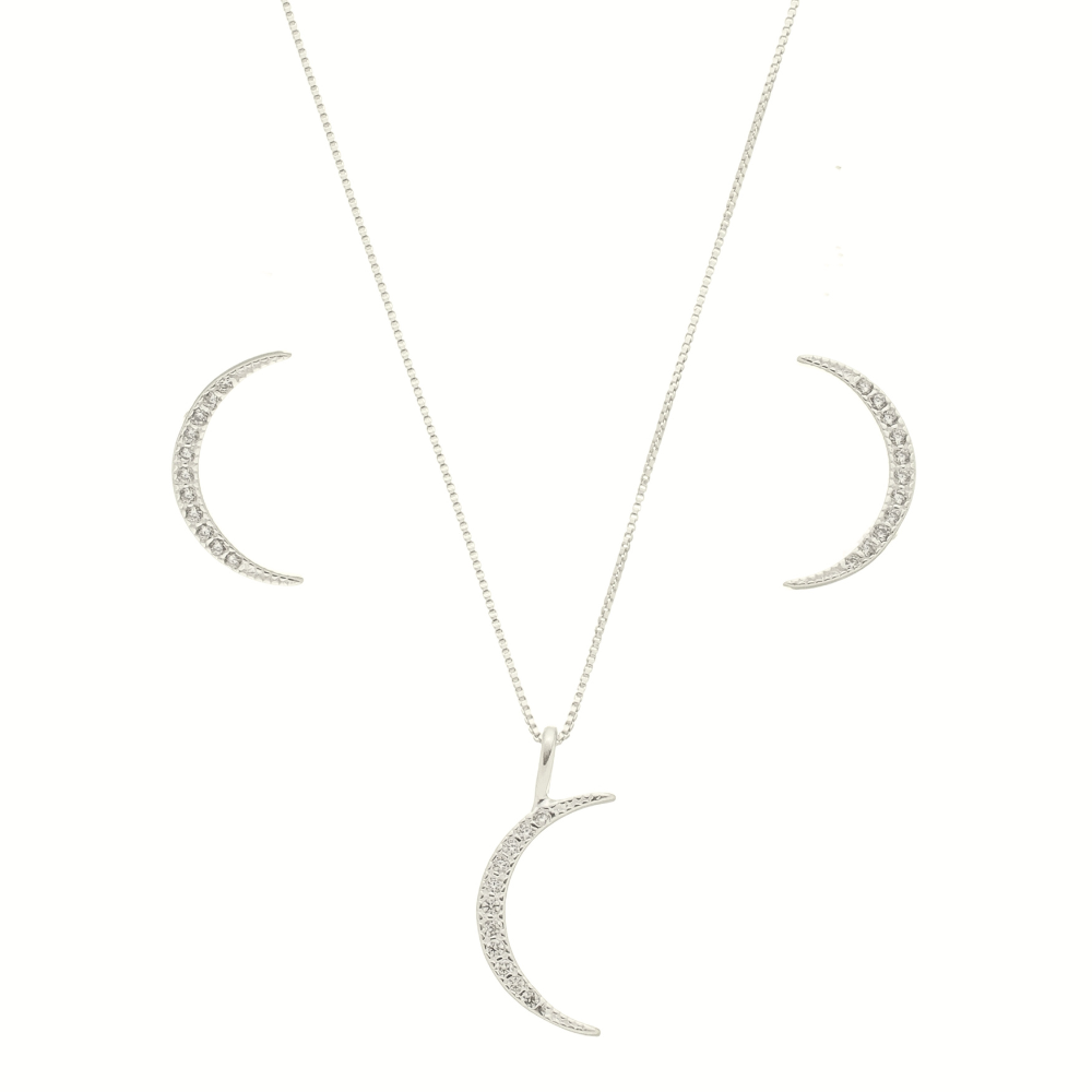 Moderno e delicado conjunto de brincos no formato de meia lua cravejados com microzircônias na cor cristal e corrente veneziana com fecho boia, mais pingente meia lua igual ao brinco. Garantia vitalícia no metal. Inspirado em sua imponência e beleza para todos os momentos.