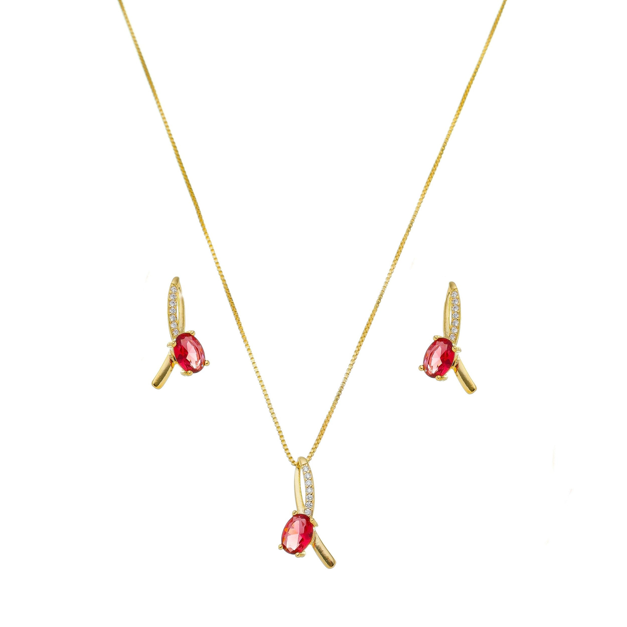 Lindo e delicado conjunto de colar e par de brincos com o pingente no formato de laço com zircônia na cor rubi e cravejado com microzircônias na cor cristal. Joia banhada em ouro amarelo 18k, antialérgica e com 1 ano de garantia.