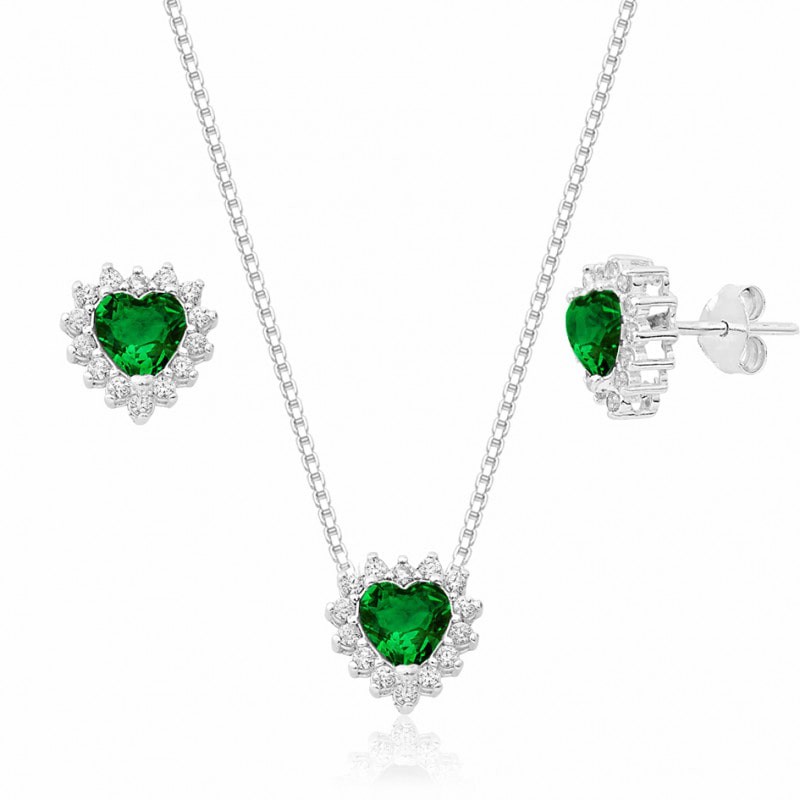 Conjunto de corrente veneziana com pingente e par de brincos de coração, cravejado com zircônias na cor cristal e com cristal na cor verde em prata branca 925. Garantia permanente no metal.