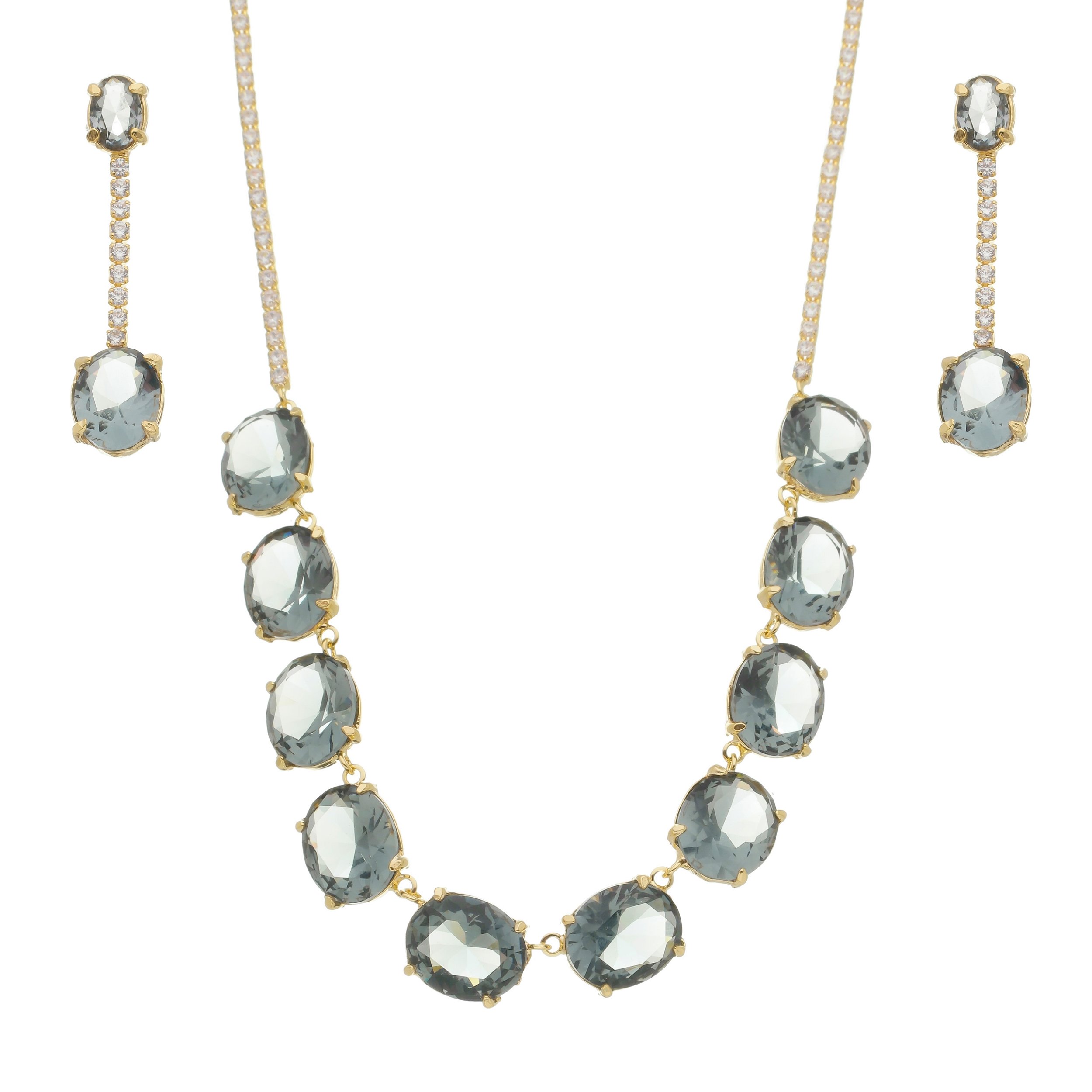 Luxuoso conjunto de colar Riviera zircônias na cor cristal e 10 pedras ovais fusion na cor fumê, fecho lagosta e par de brincos de pino com tarracha grande, corrente Riviera e 2 pedras fusion fumê. Joia banhada em ouro amarelo 18k, tratamento antialérgico com 1 ano de garantia.