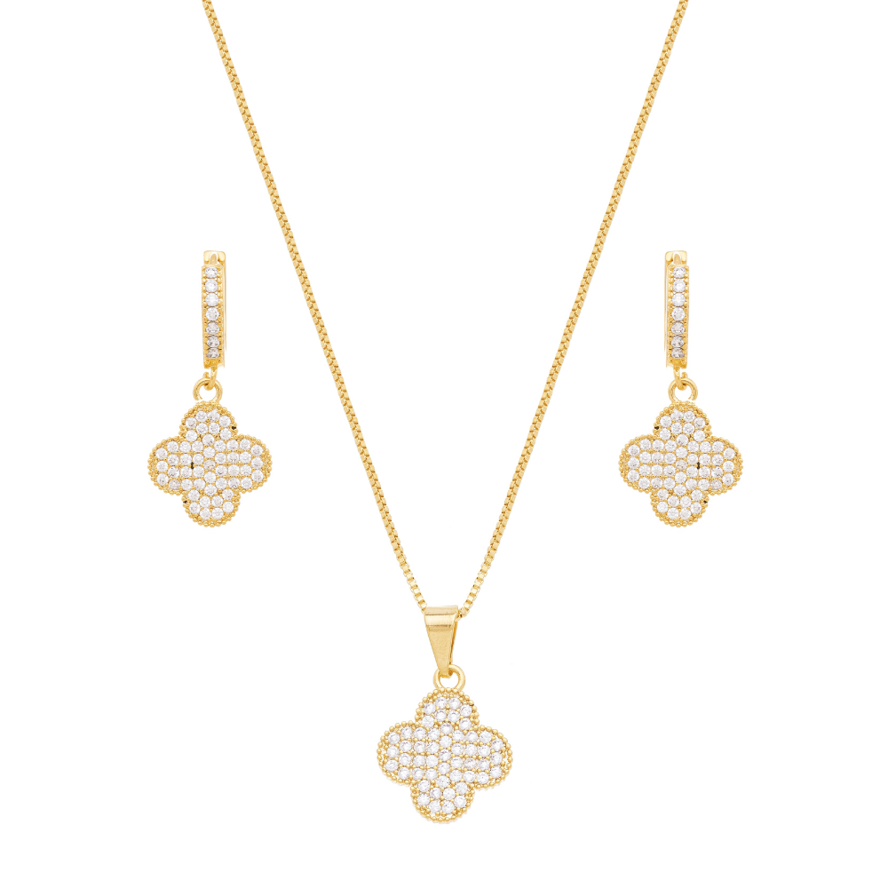 Elegante e moderno conjunto de colar com pingente e par de argolinhas com pingente no formato de trevo cravejados com microzircônias na cor cristal. Joia banhada em ouro amarelo 18k, com tratamento antialérgico e 1 ano de garantia. Um toque de elegância para você arrasar em qualquer ocasião.