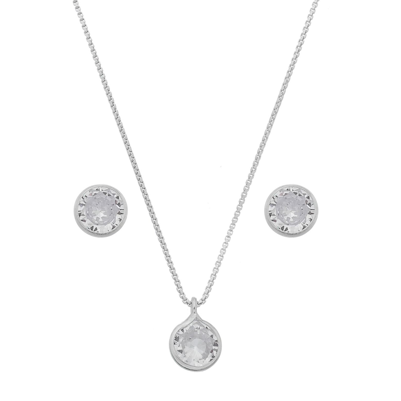 Corrente fina veneziana com pingente e par de brincos ponto de Luz zircônia prata 925.