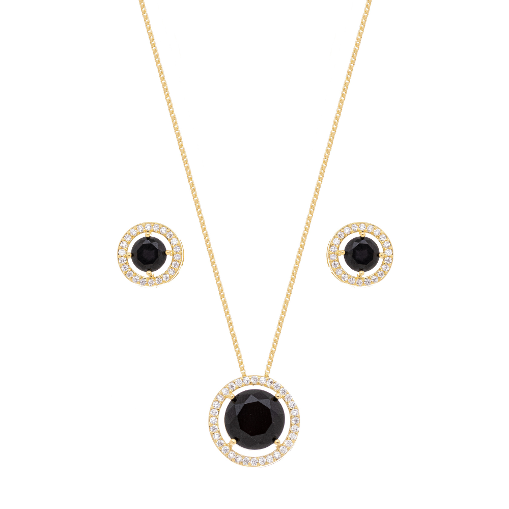 Elegante e delicado conjunto de colar com pingente e par de brincos no formato redondo com zircônia preta cravada no meio e cravejado em volta com microzircônias na cor cristal. Joia banhada em ouro amarelo 18k, com tratamento antialérgico e 1 ano de garantia. Peças únicas e perfeitas para todas as ocasiões.