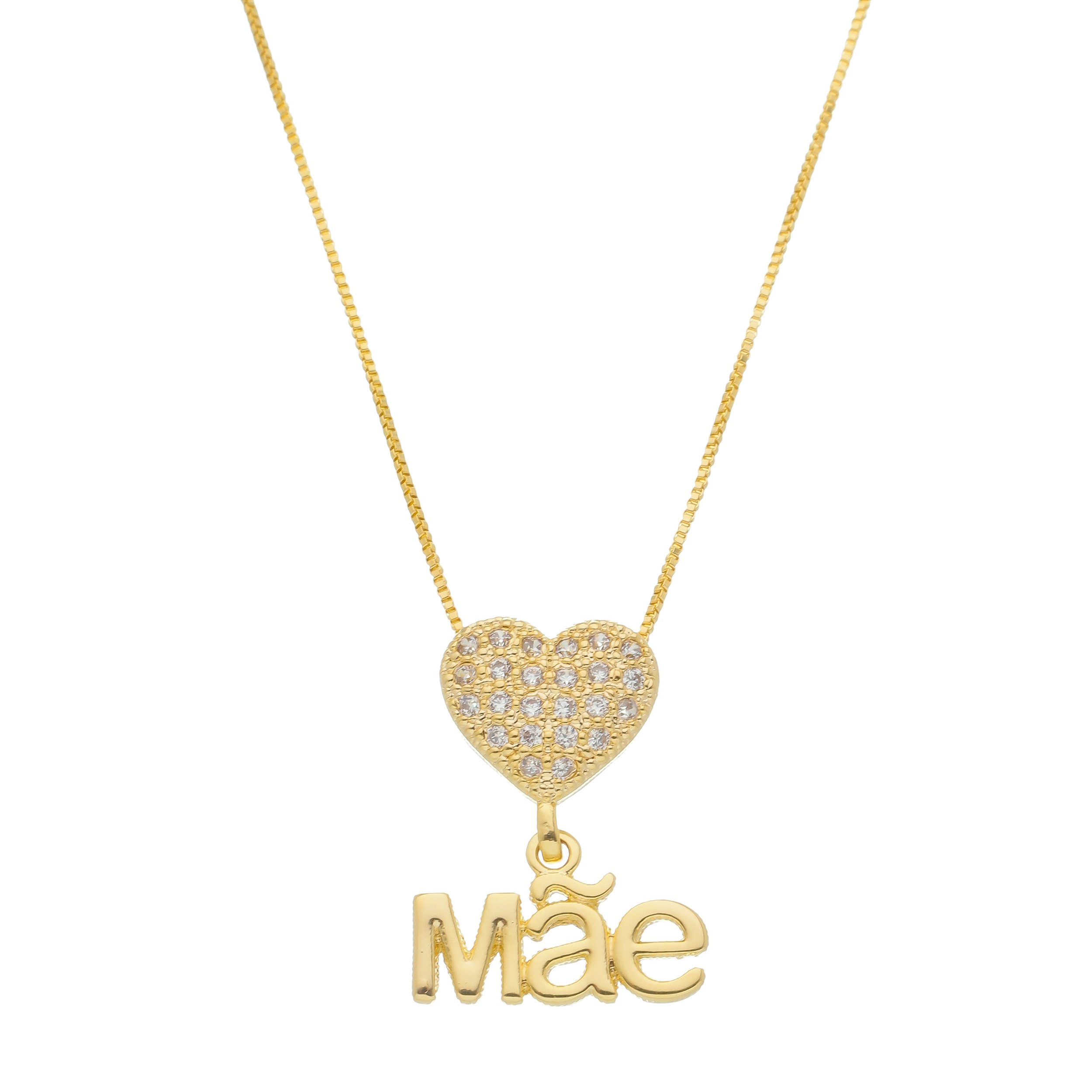 Lindo e delicado colar de corrente veneziana com fecho lagosta, pingente no formato de coração cravejado com zircônias na cor cristal, pingente com a palavra mãe. Semijoia banhada em 10 milésimos de ouro 18k, tratamento antialérgio e garantia de 1 ano. Para a melhor mãe do mundo.