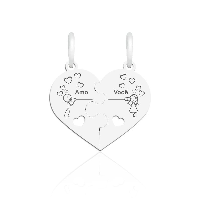 Delicado e moderno pingente a laser divido em duas partes no formato de coração amo você em prata 925. Garantia vitalícia. Medindo 16mm x 18mm.