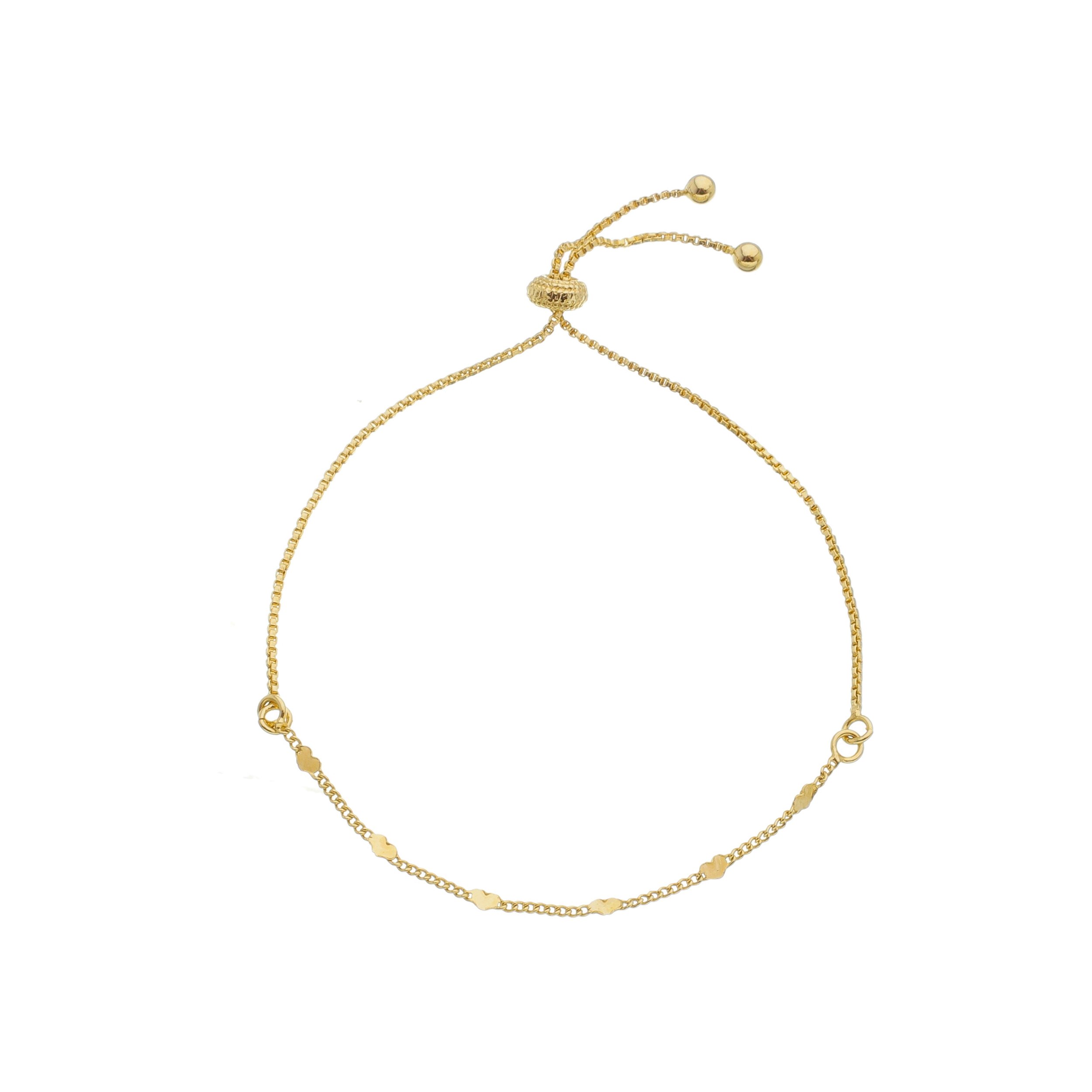 Linda pulseira ajustável com mini corações e bolinhas na ponta. Semijoia banhada com 10 milésimos de ouro 18K, tratamento antialérgico e 1 ano de garantia. Com você em todos os momentos, demonstrando sua beleza e grandiosidade.