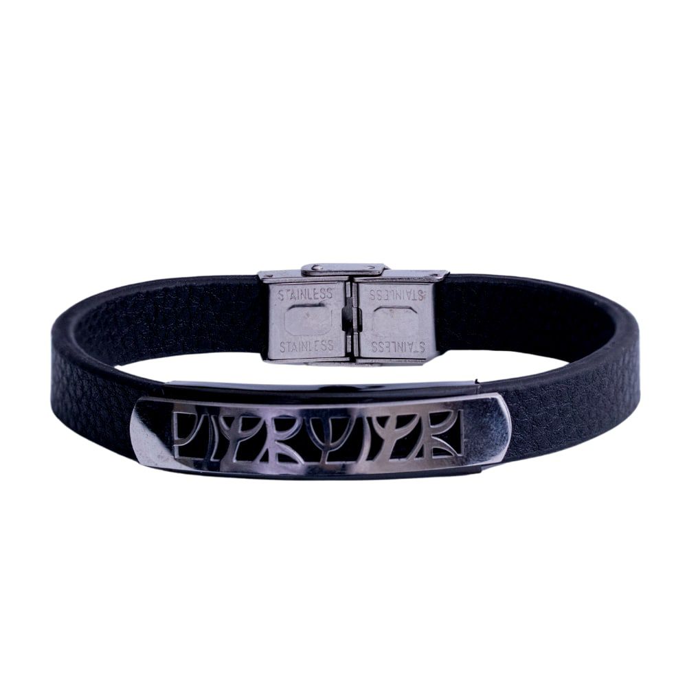 Pulseira masculina com couro preto, placa e fecho relógio em aço inox. Garantia de 1 ano. Seja nos momentos de celebração ou em seu dia-a-dia, o design e qualidade estarão com você.